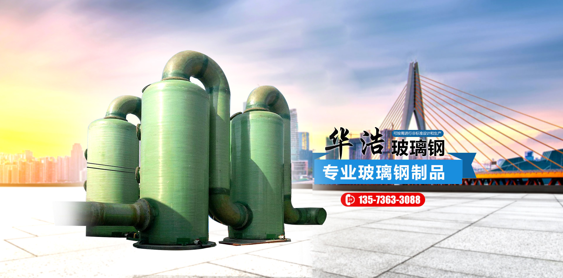 山東華浩玻璃鋼有限公司,位于世界風箏都濰坊市南三十公里處,是生產各種玻璃鋼制品的專業公司。   華浩玻璃鋼生產各種立式、臥式玻璃鋼罐、玻璃鋼儲罐、玻璃鋼運輸罐、標準運輸罐、玻璃鋼鹽酸罐、化學反應罐、真空壓力罐、設備罐、復合罐、玻璃鋼儲槽、大型玻璃鋼容器;玻璃鋼化糞池;各種型號的橫流式、逆流式(圓形、方形)玻璃鋼冷卻塔;機械纏繞玻璃鋼管道、管件、壓力管道,有機、無機通風管道、空調管道;漂液洗鼓、耐腐耐高溫反應釜、印染布車、組合式玻璃鋼水箱、玻璃鋼風機、玻璃鋼不定型工藝品等二百多個品種。